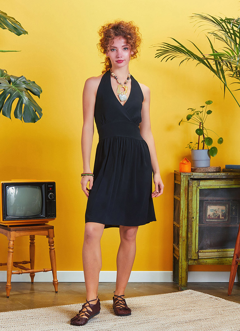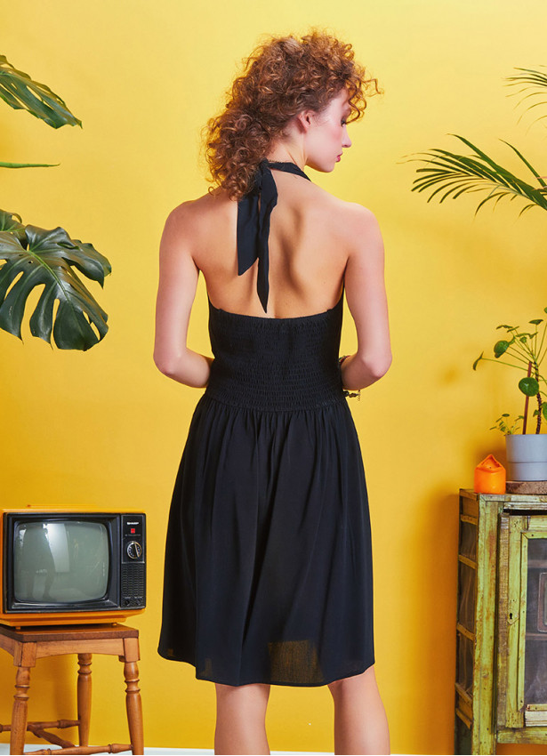 Anvelop Yaka Boyundan Bağlamalı Kısa Siyah Elbise 5200