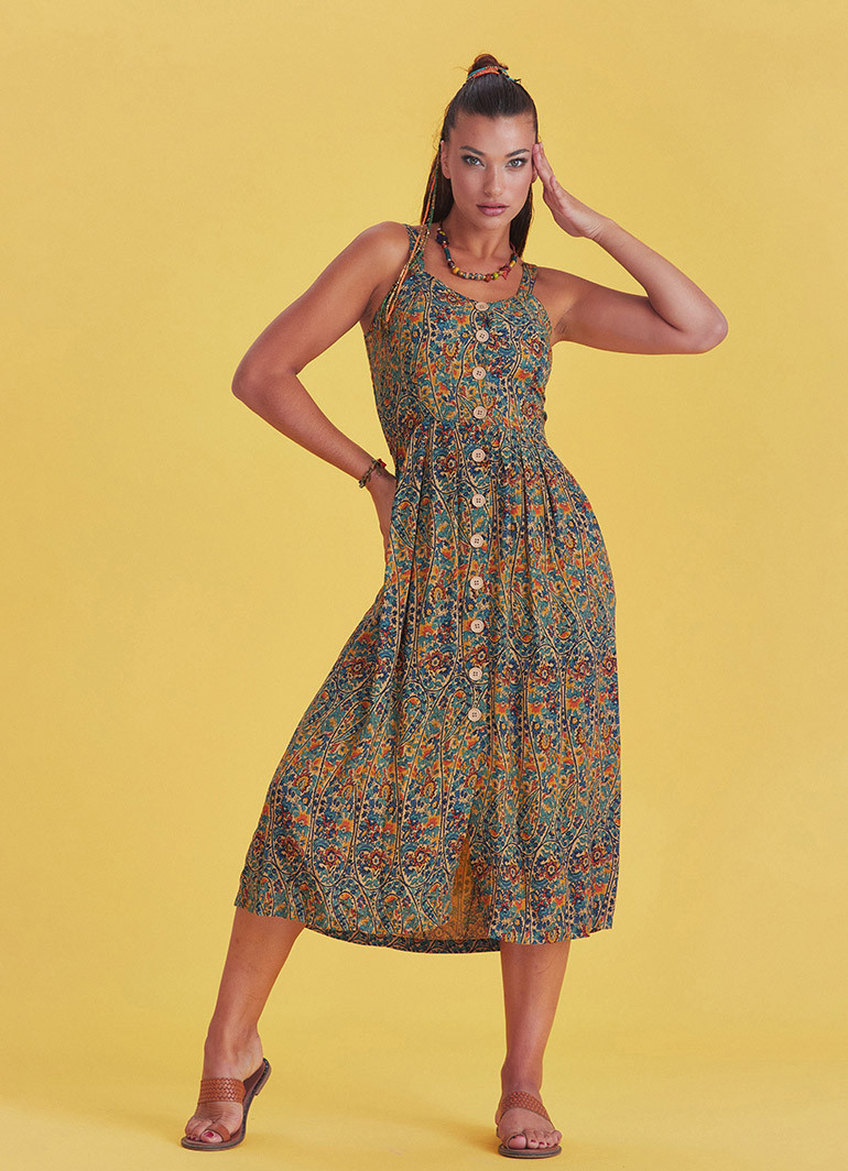 Etnik Desenli, Bohem Tarz, Geniş Askılı, Düğme Detaylı, Otantik Kadın Yazlık Uzun Elbise.