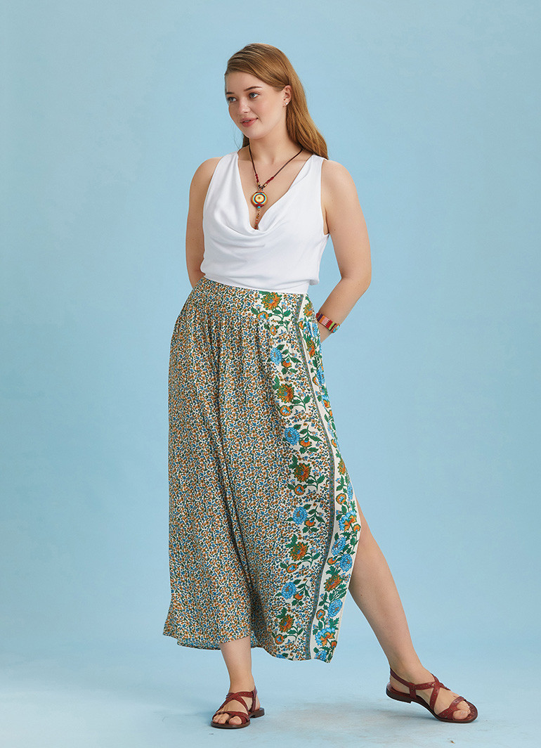 Arka Bel Gipe Lastikli, Derin Yan Yırtmaç Detaylı, Çiçekli Uzun Etek, Büyük Beden Etek