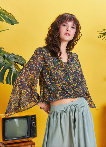 Çiçekli Desenli İspanyol Kol Crop Bluz 6258