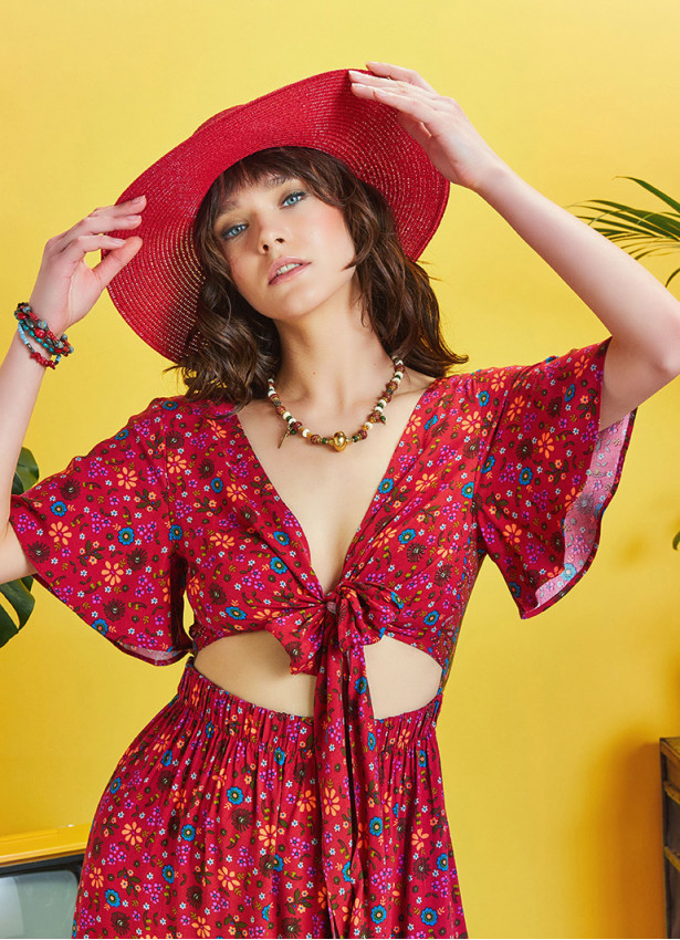 Cut Out Sırt Önden Bağlamalı Kırmızı Çiçekli Elbise 5263