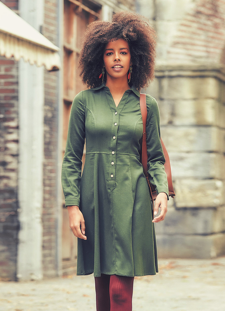 Gömlek Yaka, Düğme Detaylı, Haki, Kloş Elbise