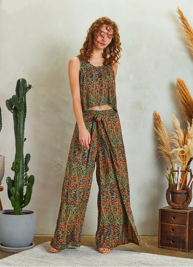 Etnik Desenli, Bohem Tarz, Kayık Yaka, Düğmeli Sırt Dekoltesi, Beli Lastikli, Kuşak ve Kapak Detaylı, Bol Paça, Otantik Kadın Tulum Elbise