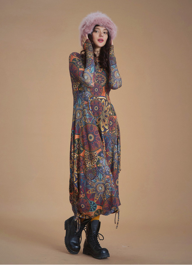 Kayık Yaka, Uzun Kol, Kışlık, Desenli Uzun Elbise