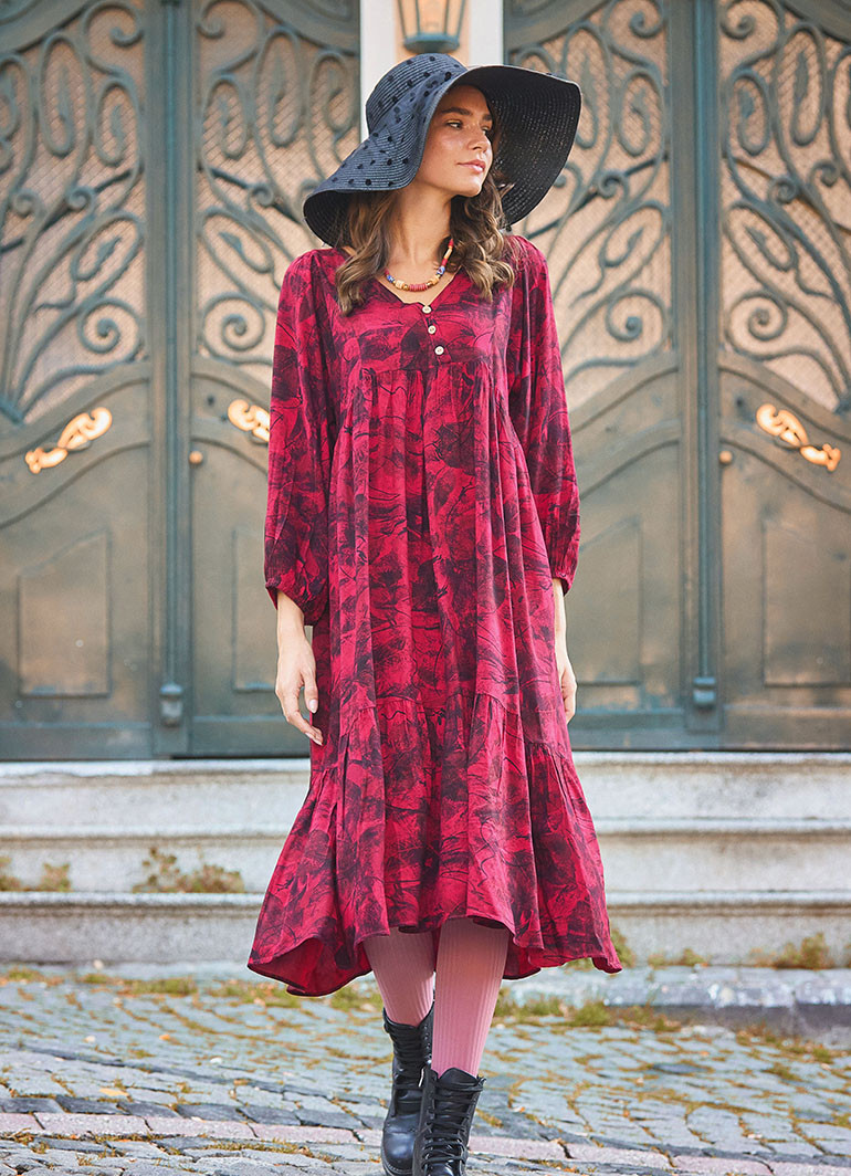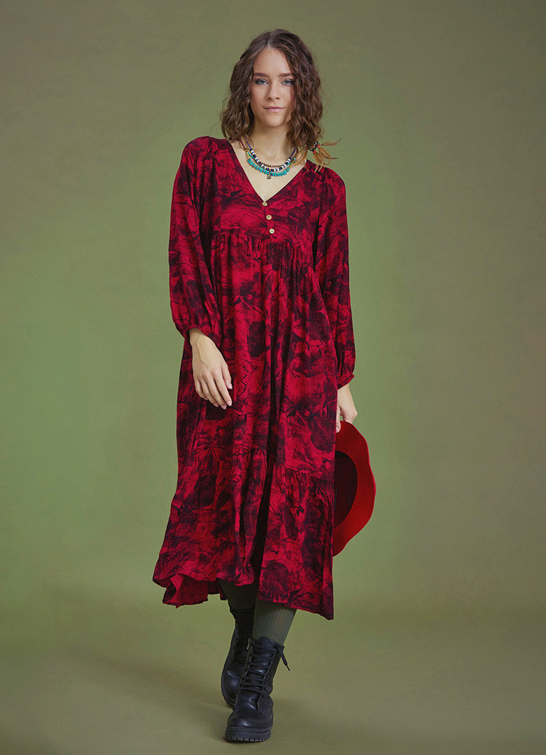 Düğme Detay V Yaka, Kol Ucu Lastikli, Uzun, Salaş, Katlı Elbise