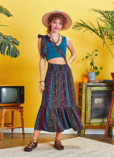 Beli Bağlamalı Salaş Midi Petrol Desenli Kloş Etek 4858