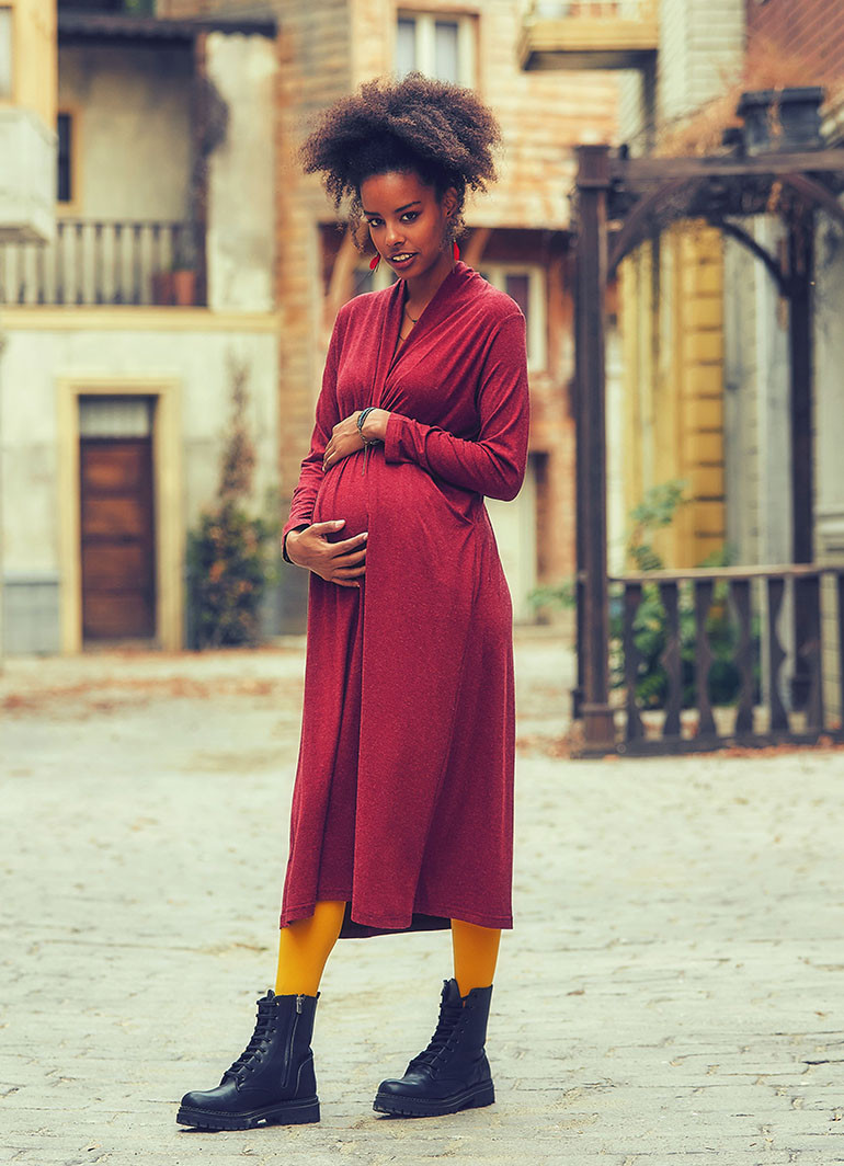 Bağcıklı, Uzun Kol, Bordo, Kışlık Hamile Elbise