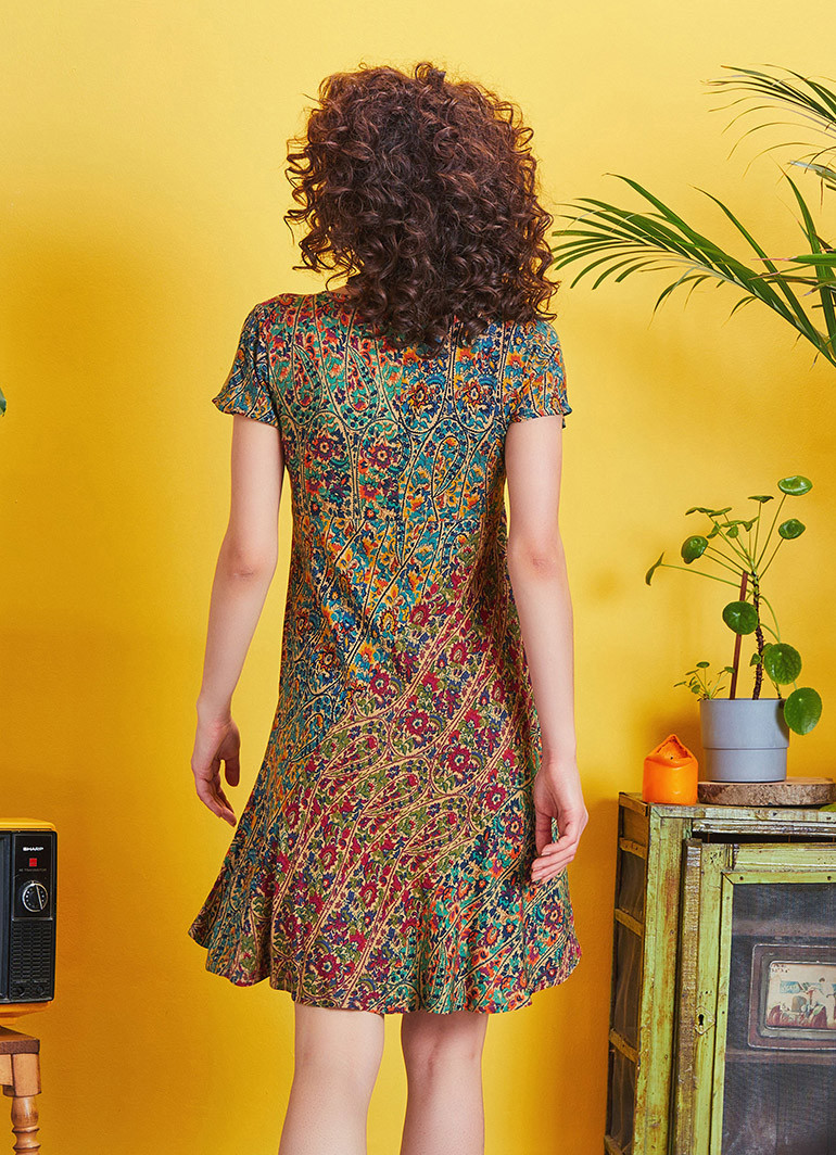 Havuz Yaka, Kısa Kollu, Ön Düğme Detaylı, Patchwork, Kısa Yazlık Elbise