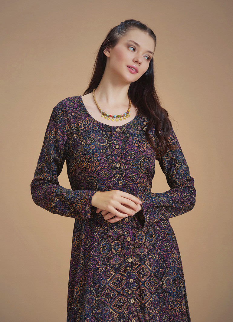 Otantik Desenli Uzun Kollu Mor Asimetrik Kesim Kışlık Kadın Elbise 6615