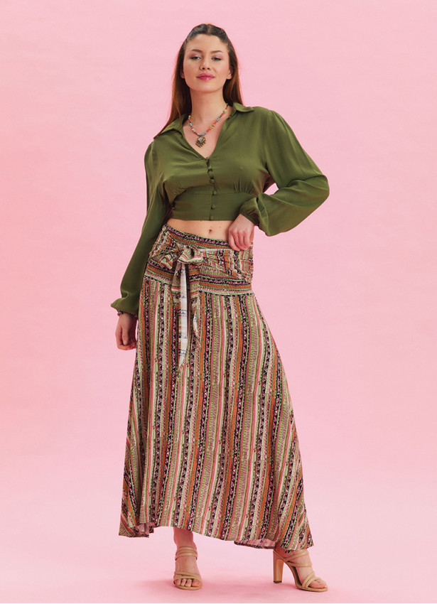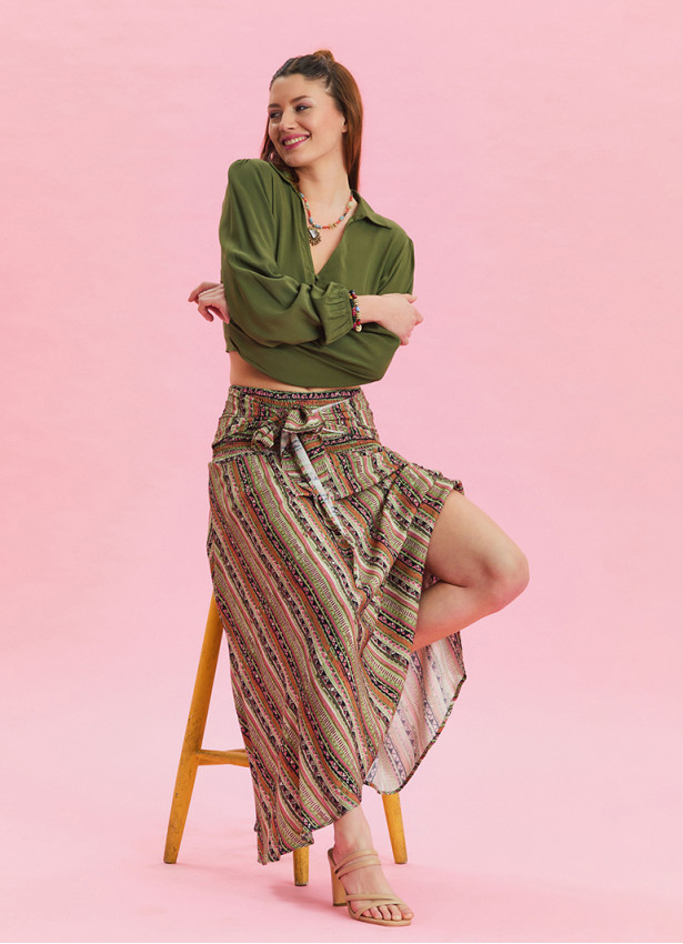 Modern çizgilerin ve zarif detayların buluştuğu Gipe Belden Bağlamalı Haki Desenli Uzun Etek 6828, yazın enerjisini yansıtan eşsiz bir tasarıma sahiptir.