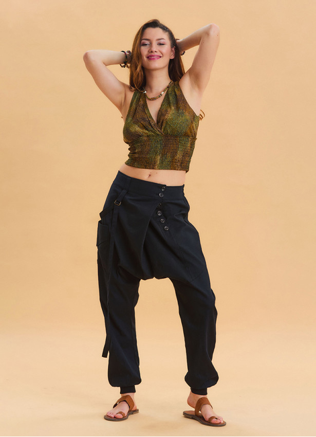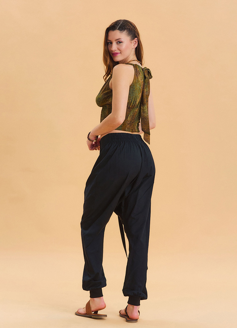 İp Detaylı Düğme Beli Lastikli Siyah Bohem Şalvar 6876, modern ve rahat bir stil arayan kadınlar için özenle tasarlandı. %100 dokuma pamuk kumaşı sayesinde terletmeyen, hafif ve nefes alabilir özelliği ile yaz aylarında ferah bir kullanım sunar.