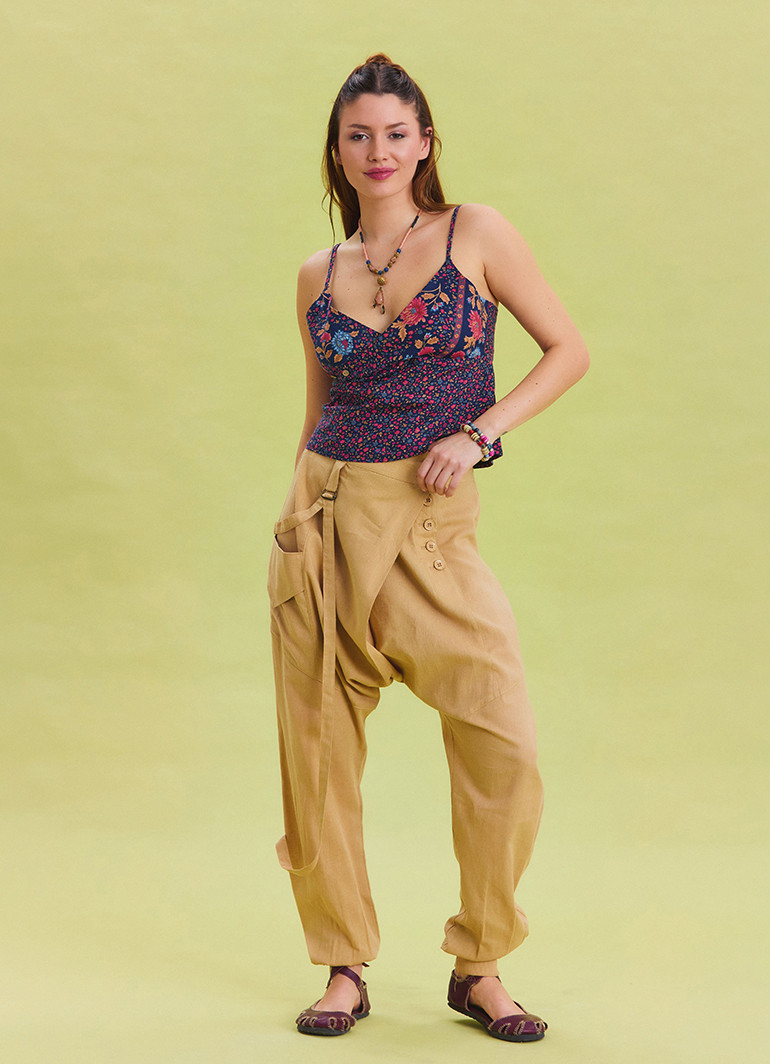 Düğme ve ip detaylarıyla özenle şekillendirilen model, cepli ve elastik paça yapısıyla günlük kullanımda maksimum rahatlık sağlarken, bohem şıklığıyla da göz dolduruyor.