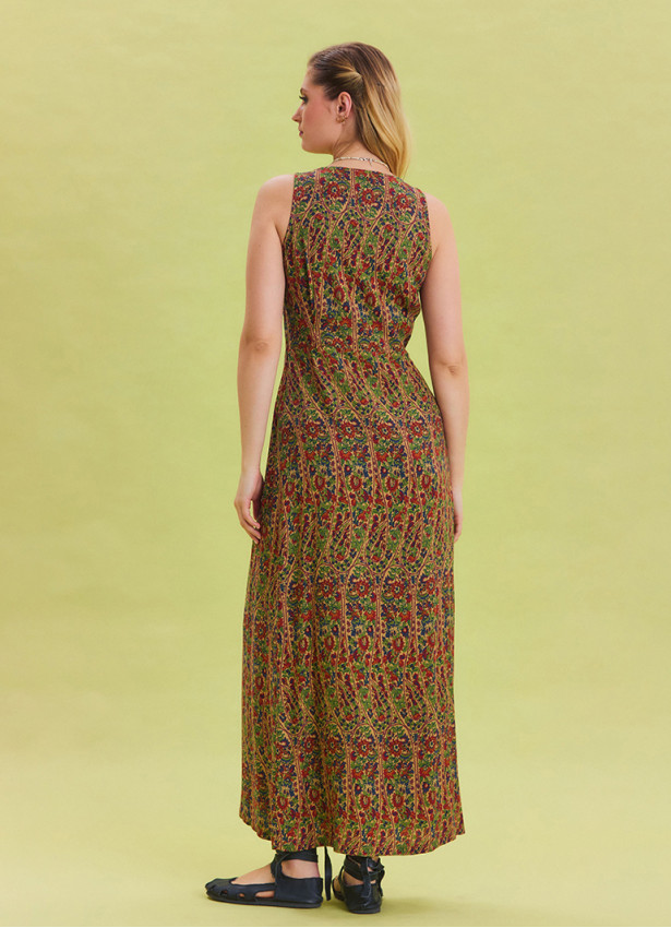 V Yaka Yırtmaç Detaylı Desenli Yeşil Uzun Elbise 6774, yaz mevsiminin tazeliğini ve enerjisini yansıtan modern bir tasarıma sahiptir. Zarif V yaka ve yırtmaç detayları, elbiseye hem şıklık hem de hareket özgürlüğü katar.