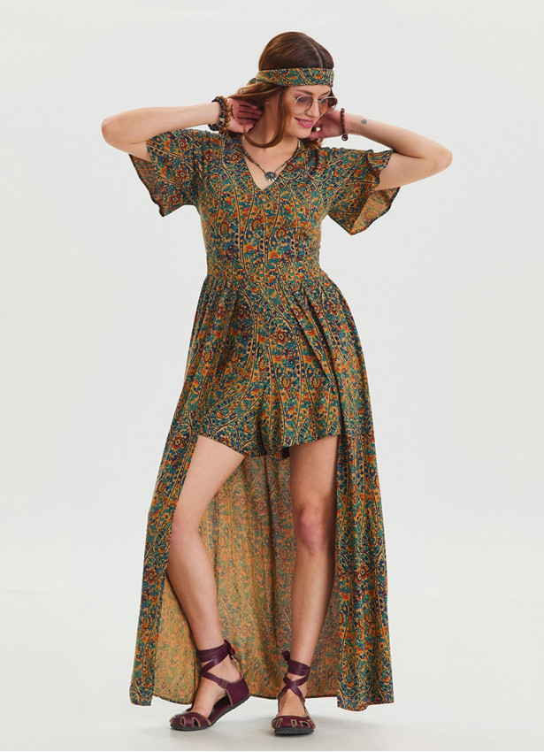 Volan Kollu Şort Detaylı Petrol Kadın Bohem Tulum 6806, modern bohem stilini yansıtan ve yaz aylarına özel tasarımıyla öne çıkan bir parçadır. Şık volan detayları ve V yaka kesimi, feminen zarafeti ortaya koyar.