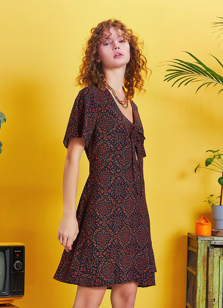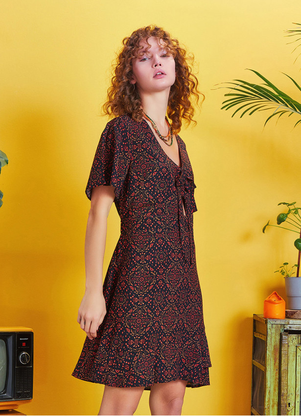 Rahat Kesim Yarım Kol, Bağlamalı V Yaka, Ön Pencere Detay, Beli Lastikli, Etek Ucu Volanlı Elbise