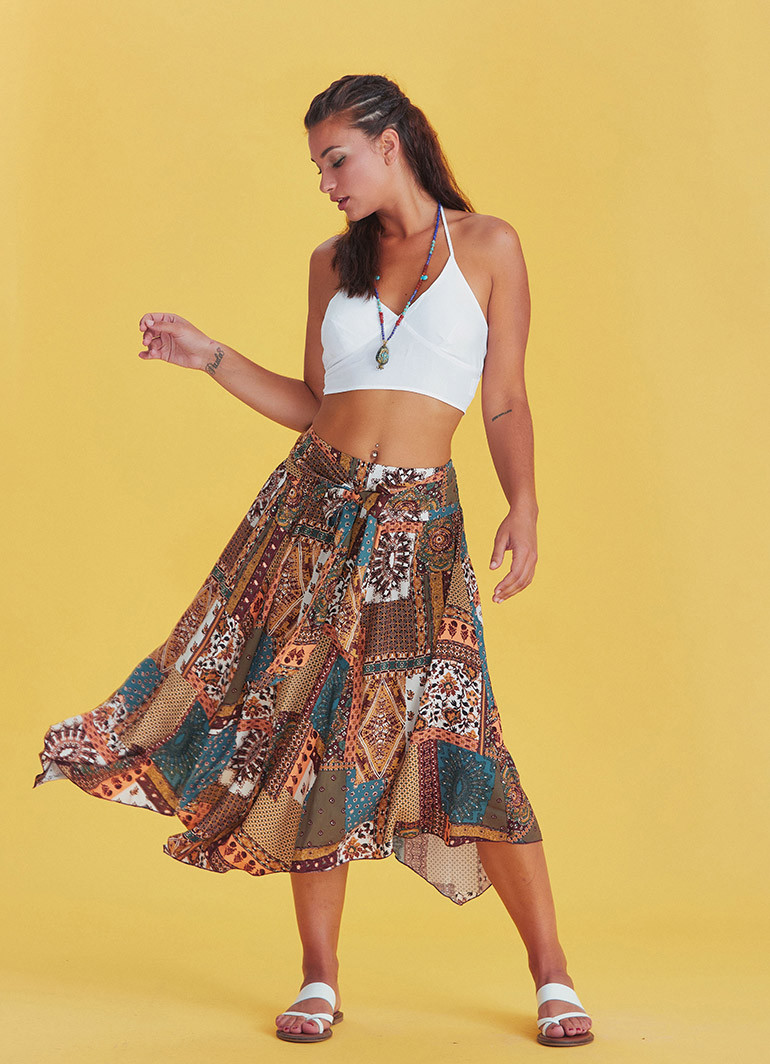 Beli Bağlamalı, Etnik Desenli, Midi Boy Etek