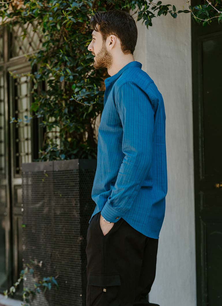 Rahat Kesim Düğmeli Uzun Kollu Mavi Çizgili Erkek Gömlek 6555