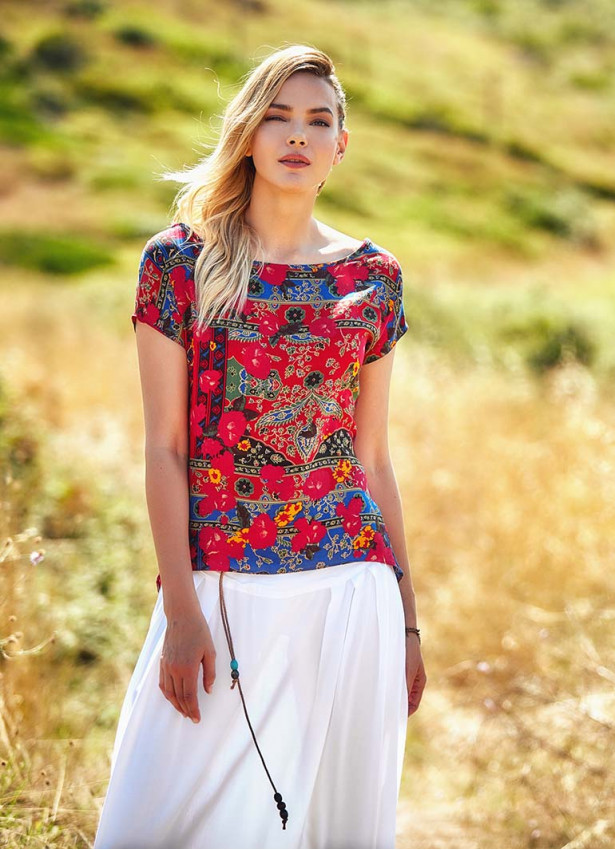 Desenli, Kayık Yaka, Önü Kısa, Arkası Uzun Bluz