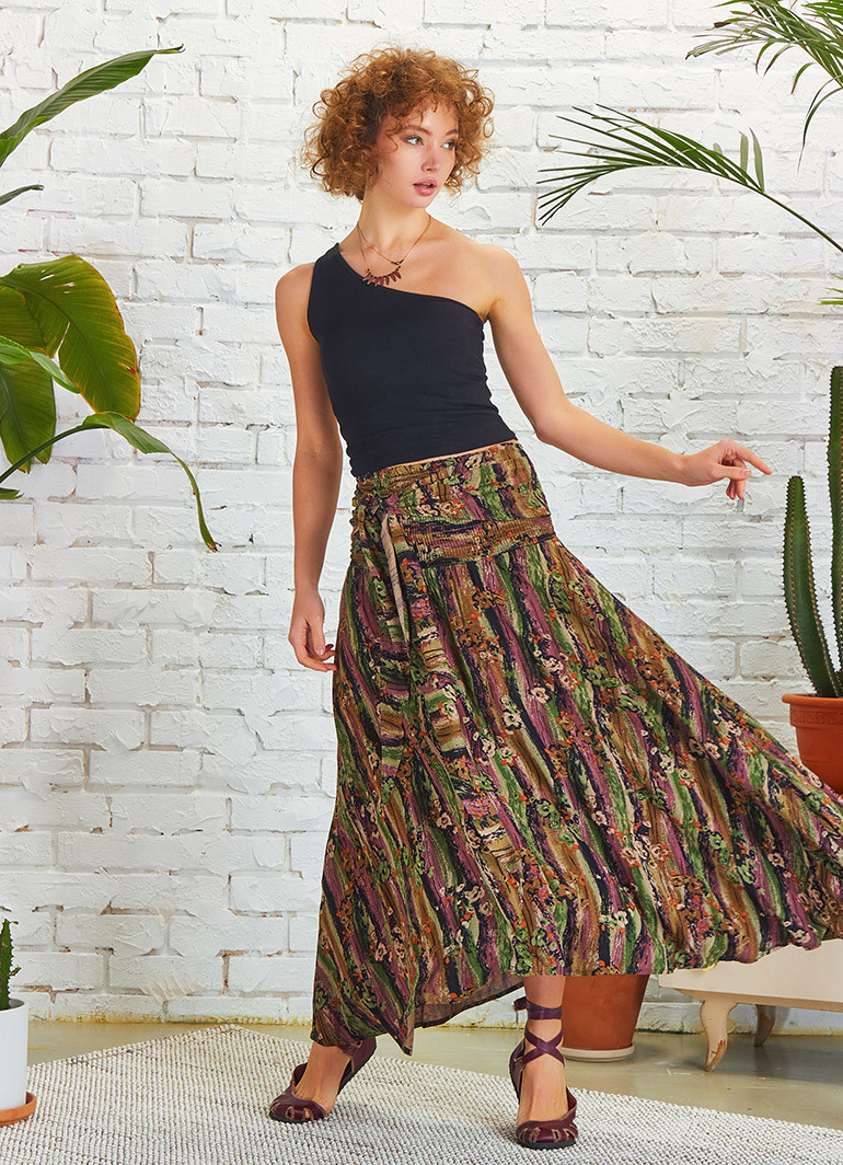 Geniş Gipe Bel Detay, Kuşaklı, Asimetrik Kesim, Desenli, Salaş, Uzun Etek