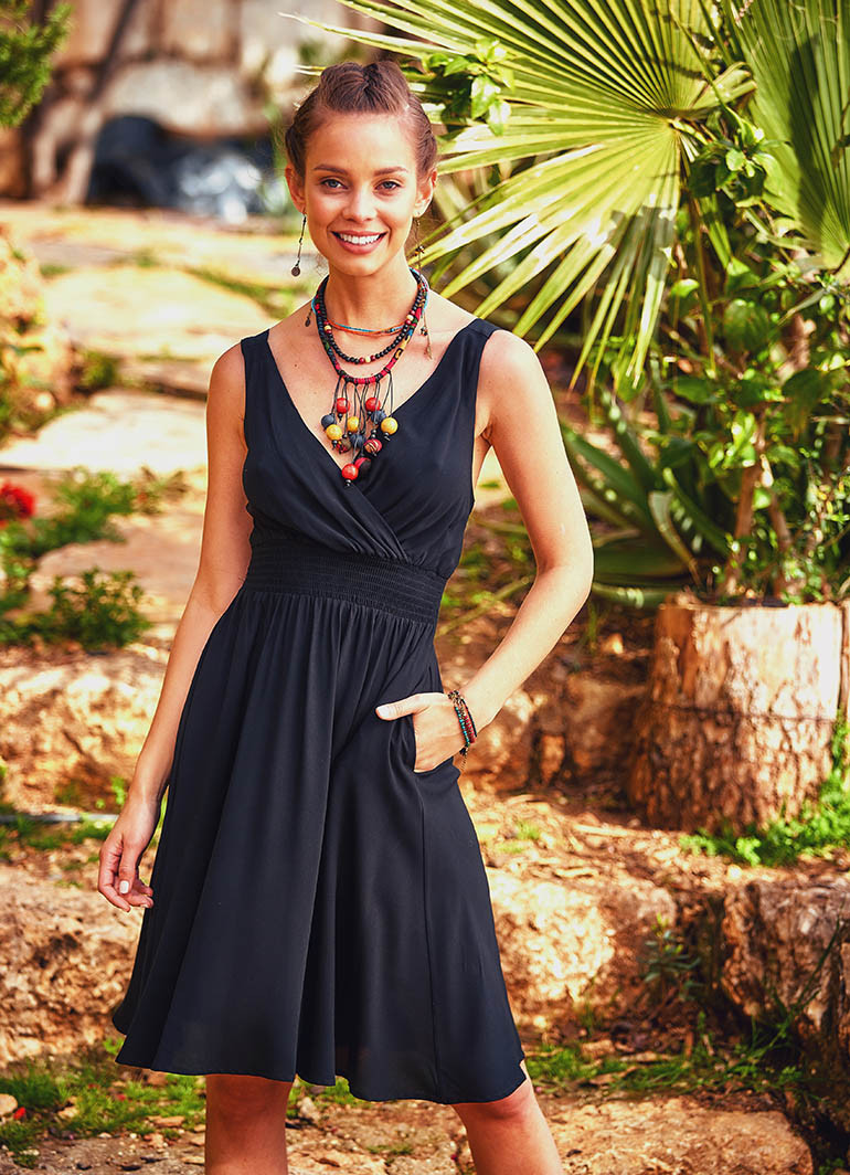 Bohem Tarz, Kruvaze V Yaka, Gizli Yan Cepler, Gipe Sırt ve Bel Detaylı, Kalın Askılı, Kloş, Otantik Kadın Siyah Yazlık Elbise.
