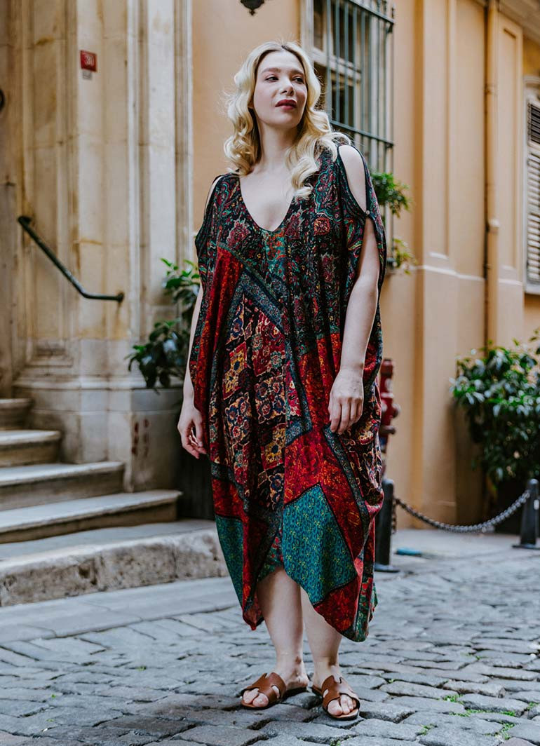 Etnik Desenli, Bohem Tarz, Kayık Yaka, Omzu Açık, Sırt Dekolteli, Otantik Kadın Yazlık Elbise.