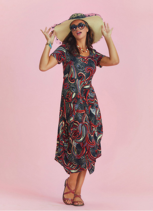 Asimetrik Etek Ucu ve Ön Cep Detaylı, Beli Bağcıklı, Yarım Kollu, Kadın, Kayık Yaka Elbise