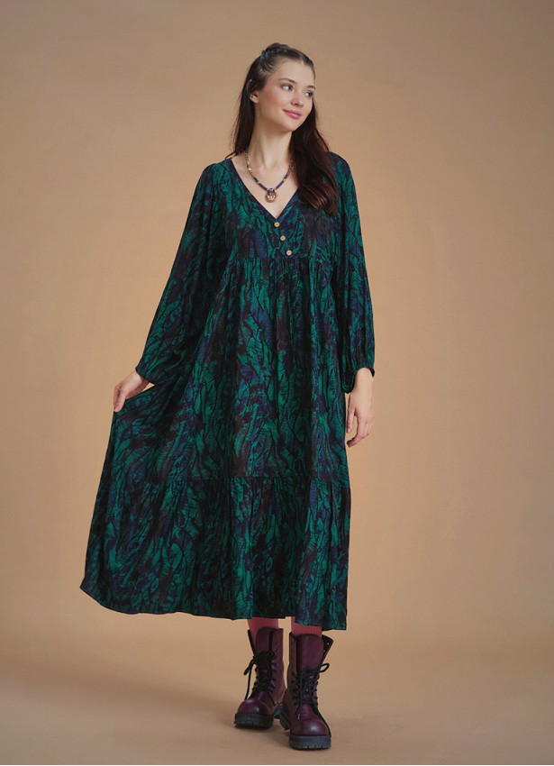 Düğme Detay V Yaka, Kol Ucu Lastikli, Uzun, Salaş, Katlı Elbise