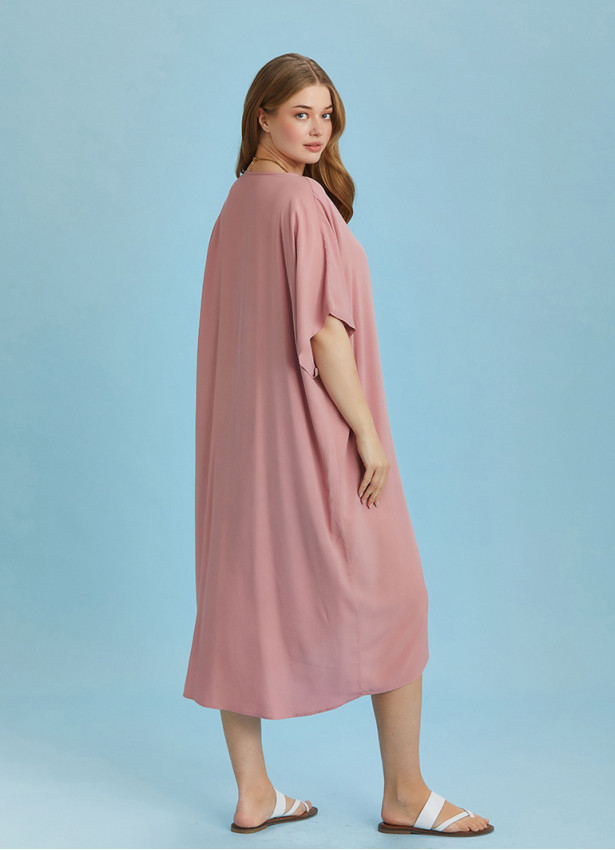 Ön Düğüm Detaylı, Bol Kesim, Yarım Yarasa Kollu, V Yaka Midi Elbise, Büyük Beden Elbise